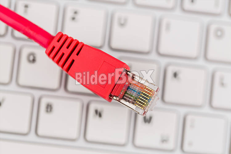 Beschreibung Netzwerkkabel auf Tastatur, Symbolfoto für Flatrate, E-Commerce, globale Kommunikation