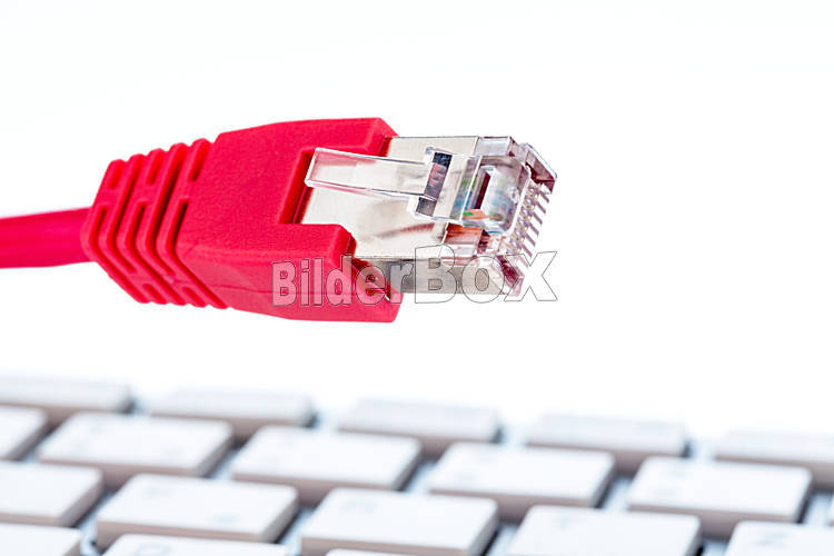 Beschreibung Netzwerkkabel auf Tastatur, Symbolfoto für Flatrate, E-Commerce, globale Kommunikation