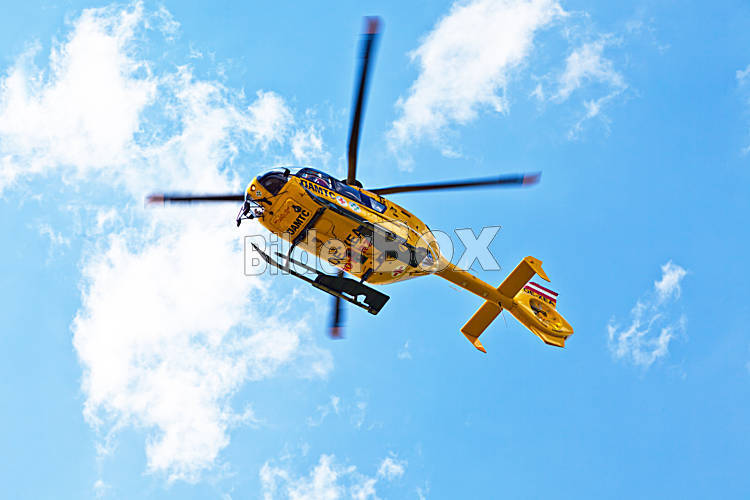 Beschreibung Notarzt und rettungshubschrauber im Einsatz. Bergung eines Verletzten nach einem Unfall