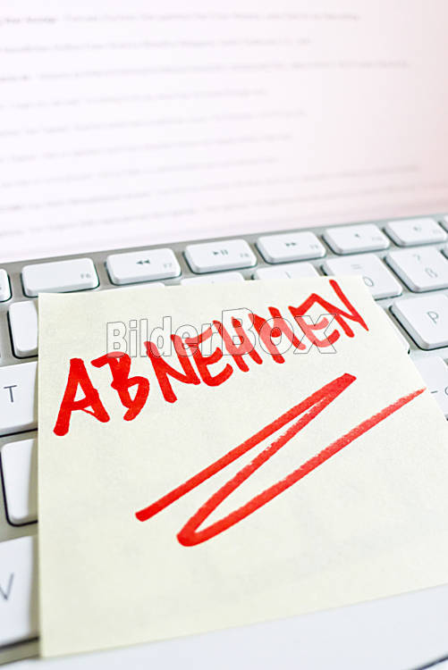 Beschreibung Ein Notizzettel liegt auf der Tastatur eines Computers zur Erinnerung: Abnehmen