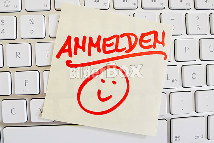 Beschreibung Ein Notizzettel liegt auf der Tastatur eines Computers zur Erinnerung: Anmelden