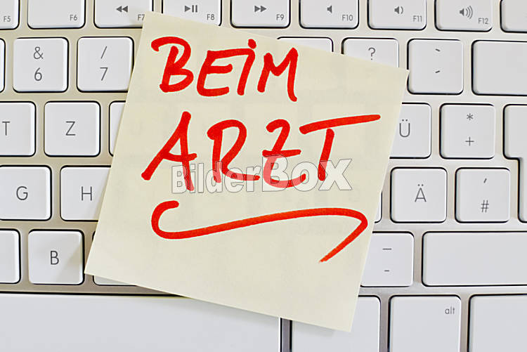 Beschreibung Ein Notizzettel liegt auf der Tastatur eines Computers zur Erinnerung: Beim Arzt