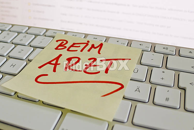Beschreibung Ein Notizzettel liegt auf der Tastatur eines Computers zur Erinnerung: Beim Arzt