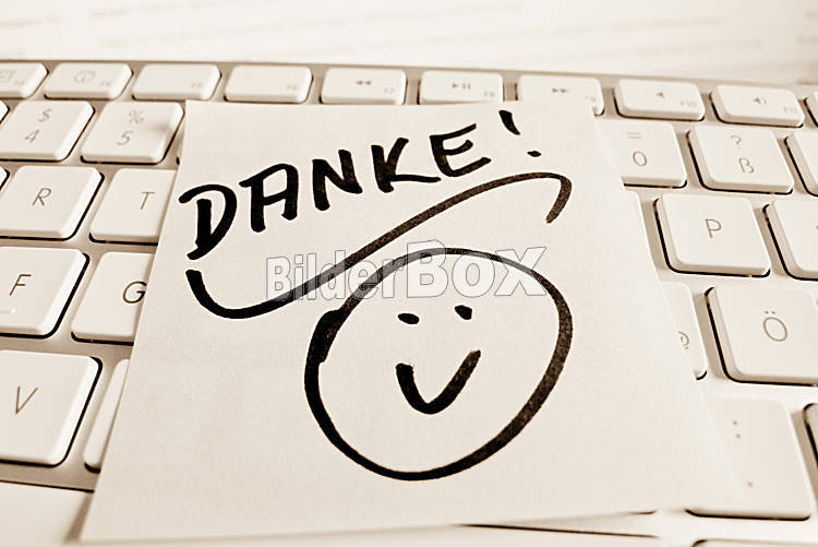 Beschreibung Ein Notizzettel liegt auf der Tastatur eines Computers zur Erinnerung: Danke