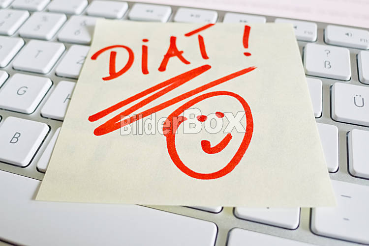 Beschreibung Ein Notizzettel liegt auf der Tastatur eines Computers zur Erinnerung: Diät