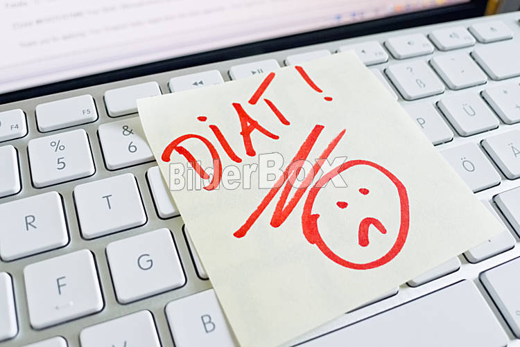 Beschreibung Ein Notizzettel liegt auf der Tastatur eines Computers zur Erinnerung: Diät