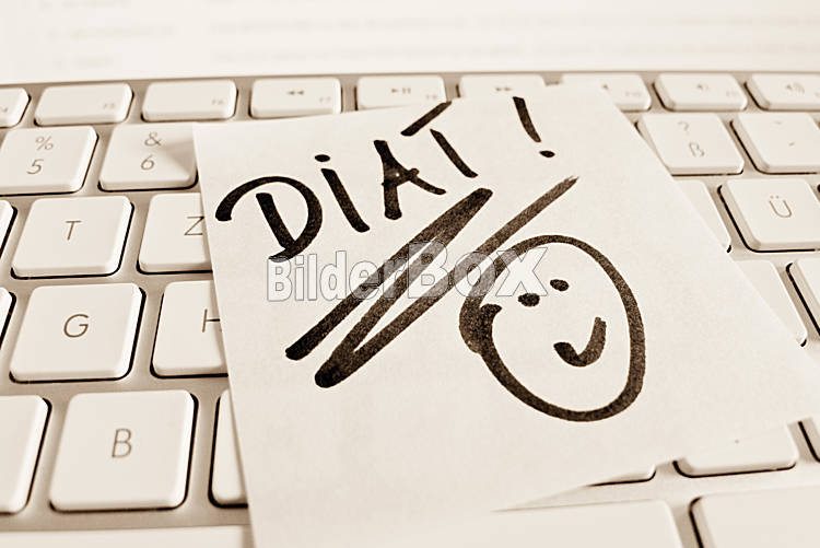 Beschreibung Ein Notizzettel liegt auf der Tastatur eines Computers zur Erinnerung: Diät