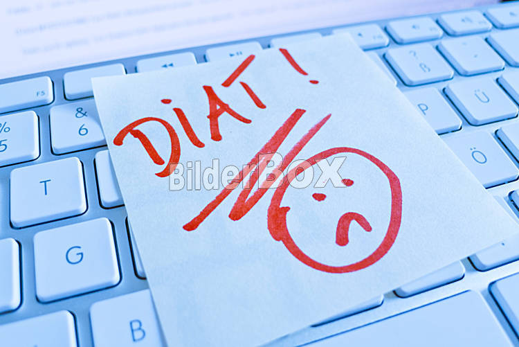 Beschreibung Ein Notizzettel liegt auf der Tastatur eines Computers zur Erinnerung: Diät