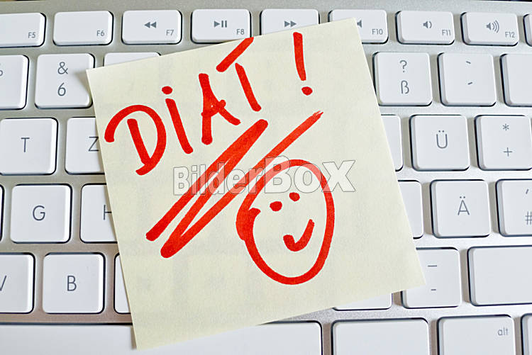 Beschreibung Ein Notizzettel liegt auf der Tastatur eines Computers zur Erinnerung: Diät