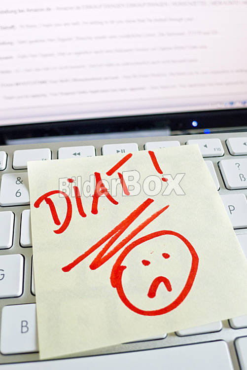 Beschreibung Ein Notizzettel liegt auf der Tastatur eines Computers zur Erinnerung: Diät