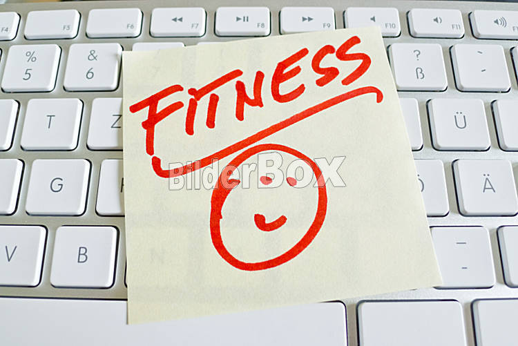 Beschreibung Ein Notizzettel liegt auf der Tastatur eines Computers zur Erinnerung: Fitness