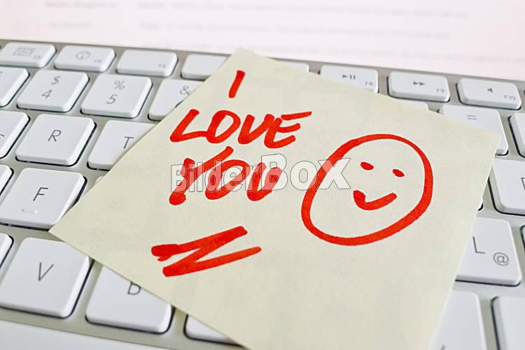 Beschreibung Ein Notizzettel liegt auf der Tastatur eines Computers zur Erinnerung: I love you