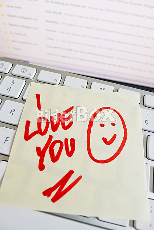 Beschreibung Ein Notizzettel liegt auf der Tastatur eines Computers zur Erinnerung: I love you
