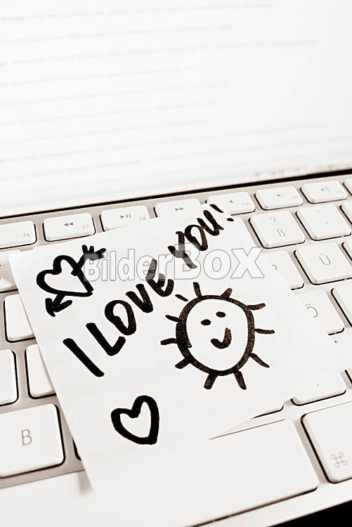 Beschreibung Ein Notizzettel liegt auf der Tastatur eines Computers zur Erinnerung: I love you