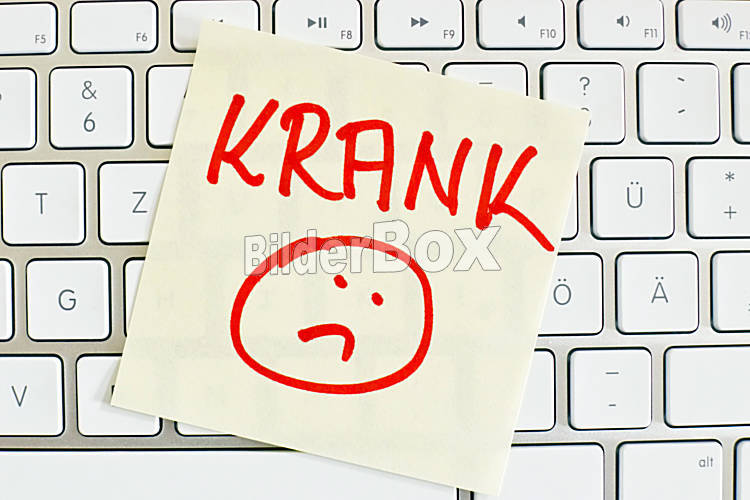 Beschreibung Ein Notizzettel liegt auf der Tastatur eines Computers zur Erinnerung: Krank