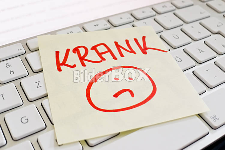 Beschreibung Ein Notizzettel liegt auf der Tastatur eines Computers zur Erinnerung: Krank