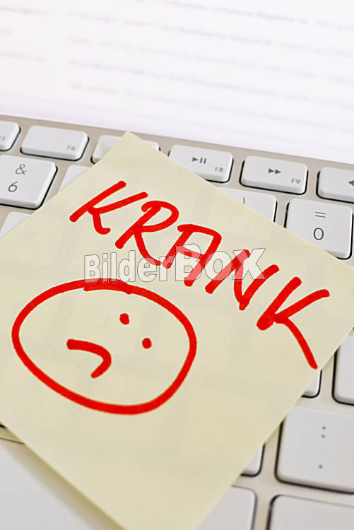 Beschreibung Ein Notizzettel liegt auf der Tastatur eines Computers zur Erinnerung: Krank