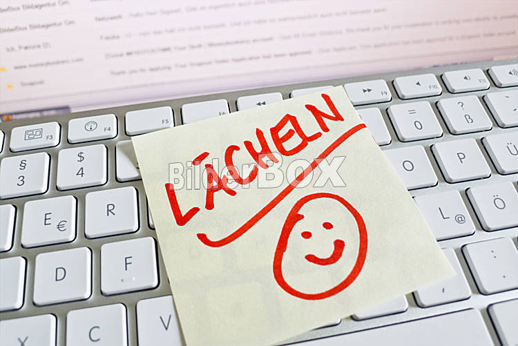 Beschreibung Ein Notizzettel liegt auf der Tastatur eines Computers zur Erinnerung: Lächeln