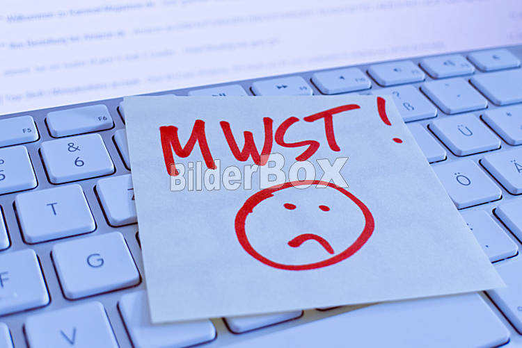 Beschreibung Ein Notizzettel liegt auf der Tastatur eines Computers zur Erinnerung: MWSt.