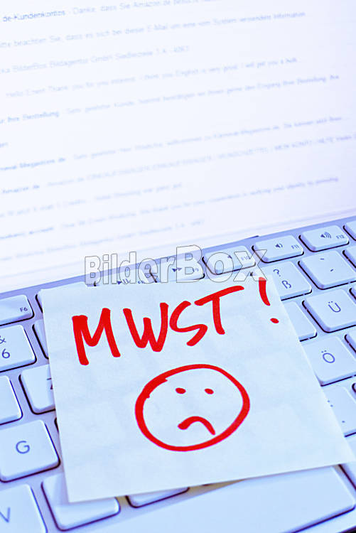Beschreibung Ein Notizzettel liegt auf der Tastatur eines Computers zur Erinnerung: MWSt.