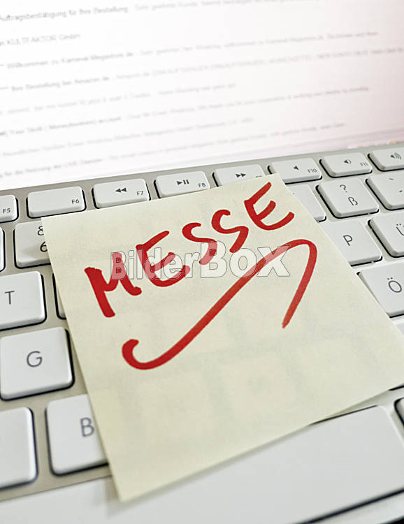 Beschreibung Ein Notizzettel liegt auf der Tastatur eines Computers zur Erinnerung: Messe