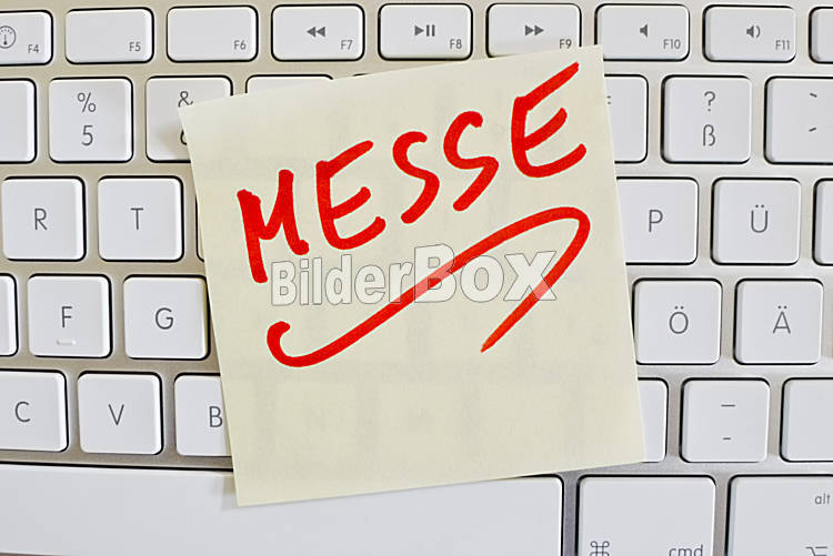 Beschreibung Ein Notizzettel liegt auf der Tastatur eines Computers zur Erinnerung: Messe