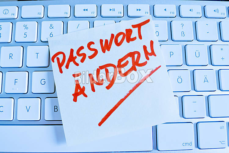 Beschreibung Ein Notizzettel liegt auf der Tastatur eines Computers zur Erinnerung: Passwort ändern