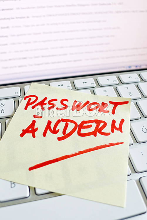 Beschreibung Ein Notizzettel liegt auf der Tastatur eines Computers zur Erinnerung: Passwort ändern