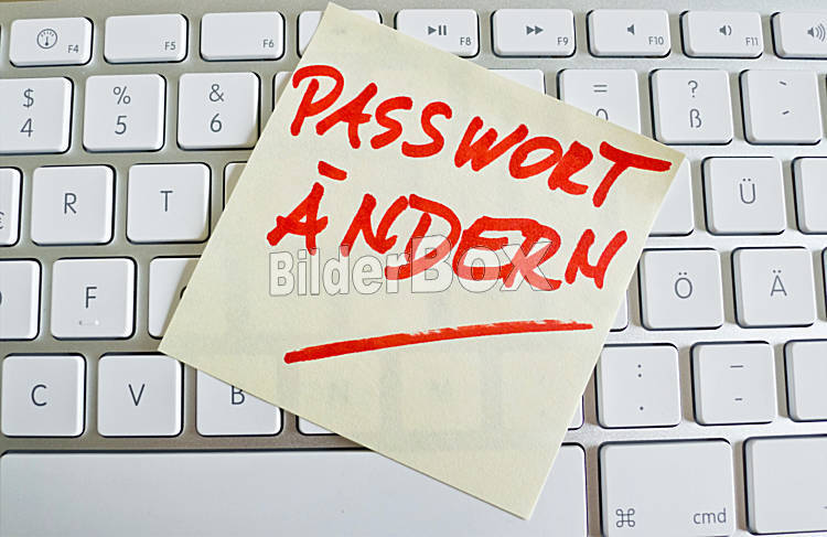 Beschreibung Ein Notizzettel liegt auf der Tastatur eines Computers zur Erinnerung: Passwort ändern