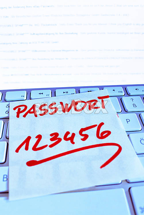 Beschreibung Ein Notizzettel liegt auf der Tastatur eines Computers zur Erinnerung: Passwort 123456