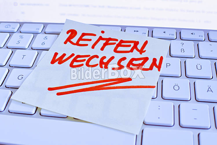 Beschreibung Ein Notizzettel liegt auf der Tastatur eines Computers zur Erinnerung: Reifen wechseln