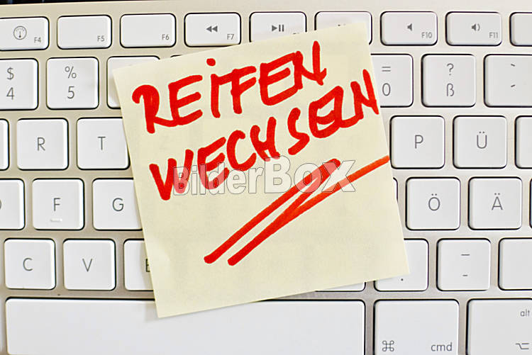 Beschreibung Ein Notizzettel liegt auf der Tastatur eines Computers zur Erinnerung: Reifen wechseln
