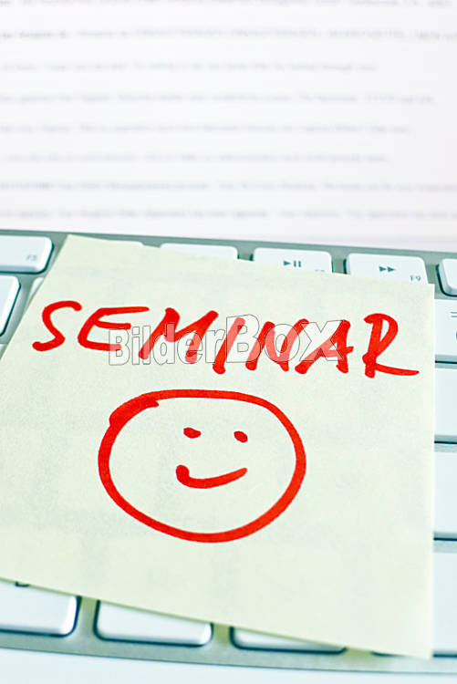 Beschreibung Ein Notizzettel liegt auf der Tastatur eines Computers zur Erinnerung: Seminar