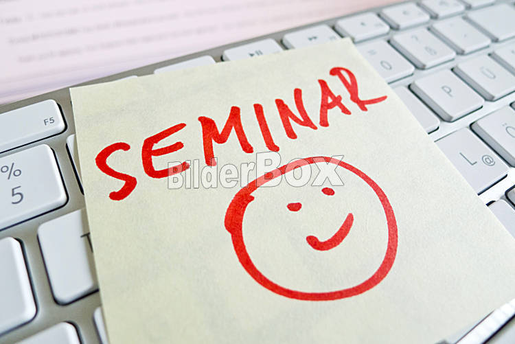 Beschreibung Ein Notizzettel liegt auf der Tastatur eines Computers zur Erinnerung: Seminar