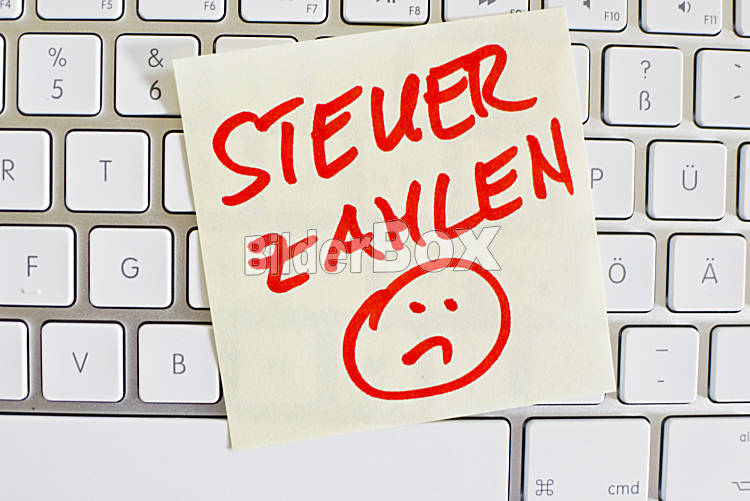 Beschreibung Ein Notizzettel liegt auf der Tastatur eines Computers zur Erinnerung: Steuer zahlen