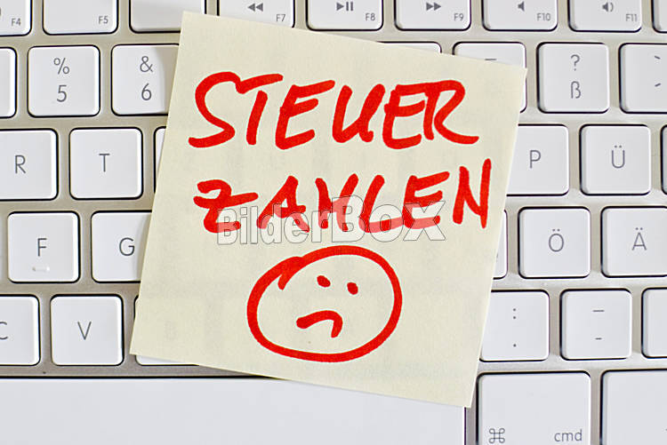 Beschreibung Ein Notizzettel liegt auf der Tastatur eines Computers zur Erinnerung: Steuer zahlen