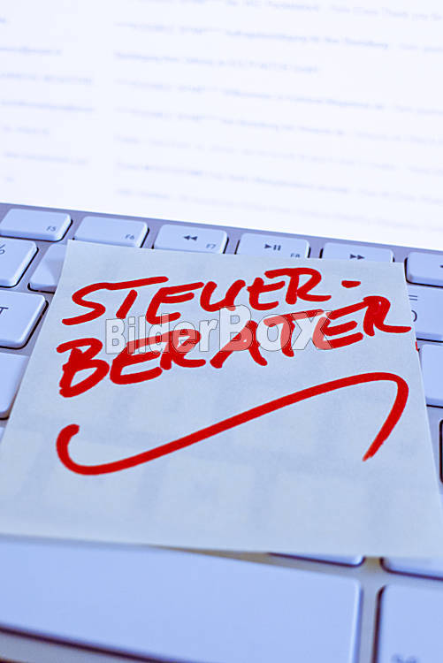Beschreibung Ein Notizzettel liegt auf der Tastatur eines Computers zur Erinnerung: Steuerberater