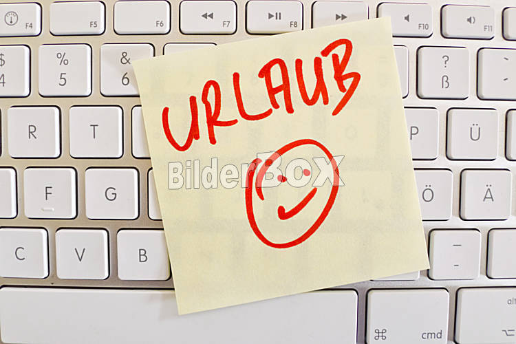 Beschreibung Ein Notizzettel liegt auf der Tastatur eines Computers zur Erinnerung: Urlaub