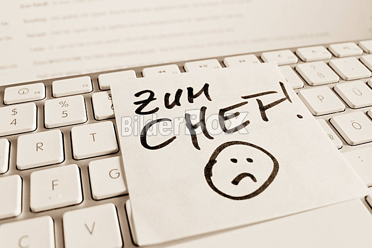 Beschreibung Ein Notizzettel liegt auf der Tastatur eines Computers zur Erinnerung: Zum Chef