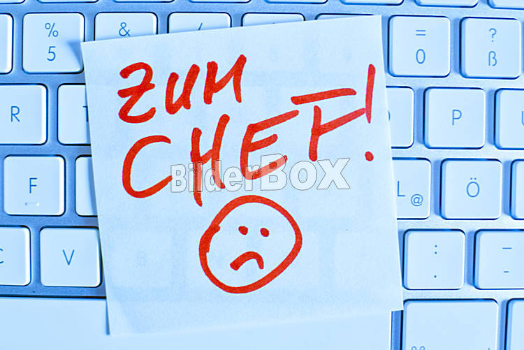 Beschreibung Ein Notizzettel liegt auf der Tastatur eines Computers zur Erinnerung: Zum Chef