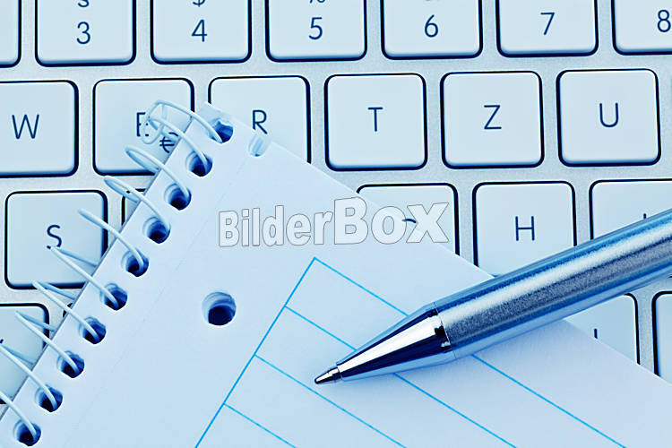 Beschreibung Ein Notizblock und die Tastatur eines Computers. Notieren und speichern.