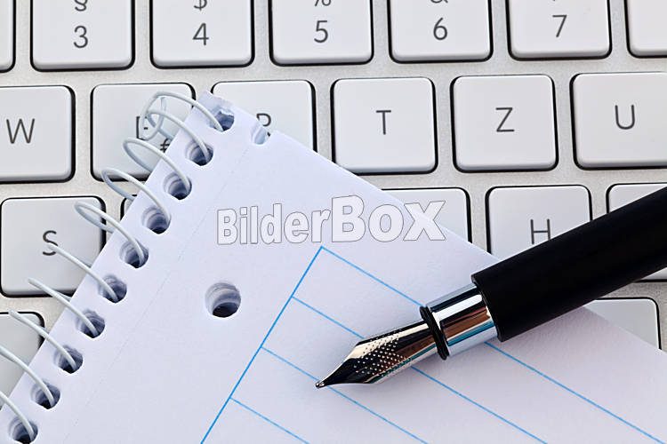 Beschreibung Ein Notizblock und die Tastatur eines Computers. Notieren und speichern.