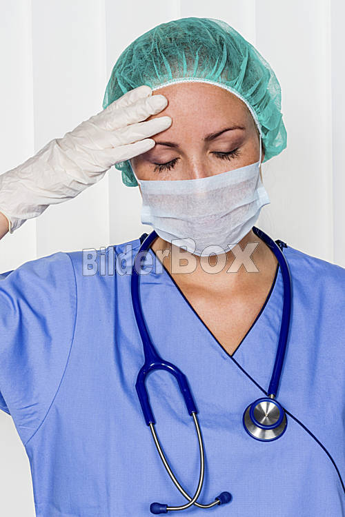 Beschreibung Eine Krankenschwester oder Ärztin in OP Kleidung vor einer Operation. Symbolfoto für Stress und Überstunden im Krankenhaus.
