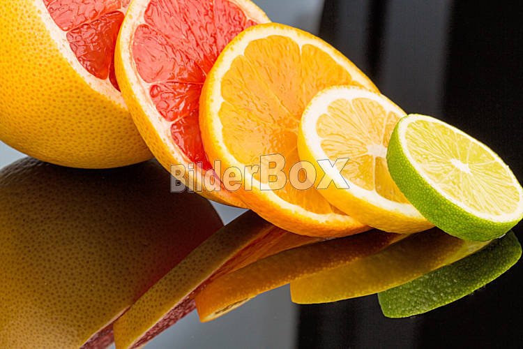 Beschreibung Scheiben einer Orange. Symbolfoto für gesunde Vitamine durch frisches Obst