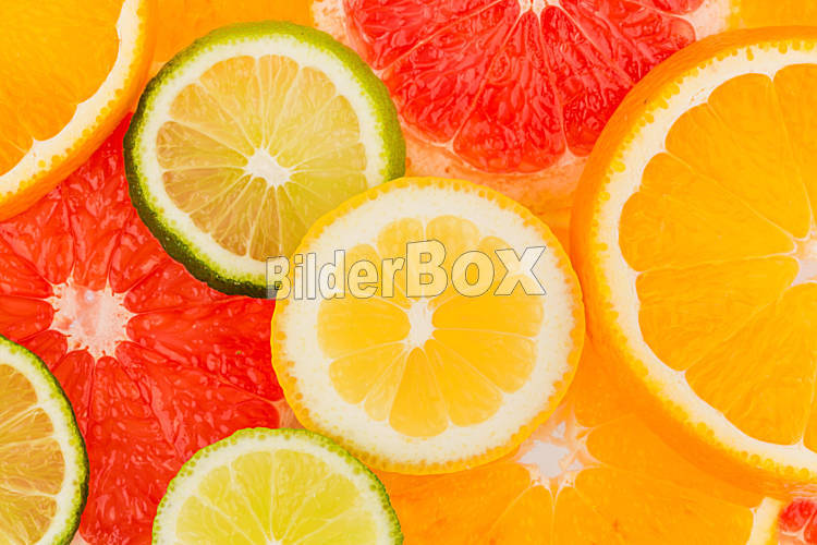 Beschreibung Scheiben einer Orange. Symbolfoto für gesunde Vitamine durch frisches Obst