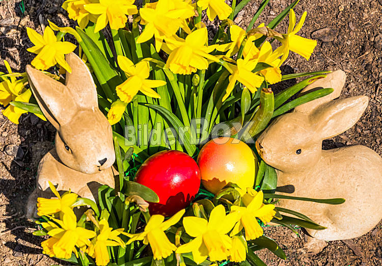 Beschreibung In einem Garten wurde ein Osternest mit Ostereier und Osterhasen versteckt. Brauchtum zu Ostern