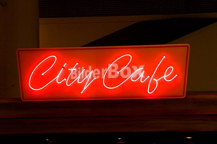 Beschreibung Aufschrift eines Kaffeehauses City, Cafe, Innenstadt, Gastronomie, Lokale, Bar, symbolisch, Leuchtreklame Copyright (2000) by BilderBox; Erwin Wodicka; A- 4062 Thening, www.bilderbox.com