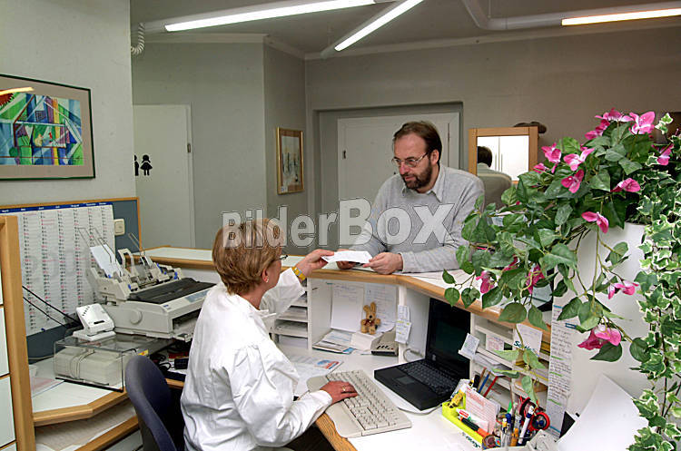 Beschreibung Ordinationshilfe mit einem Patienten mit Vorzimmer des Arztes Befunde, Krankheiten, Arbeitender, Berufe, Arbeitswelten, Arbeitsplatzförderungen, Arbeitsplätze, Arbeitsplaetze,...