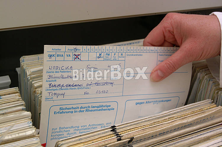 Arzthelferin beim Sortieren von Karteikarten
