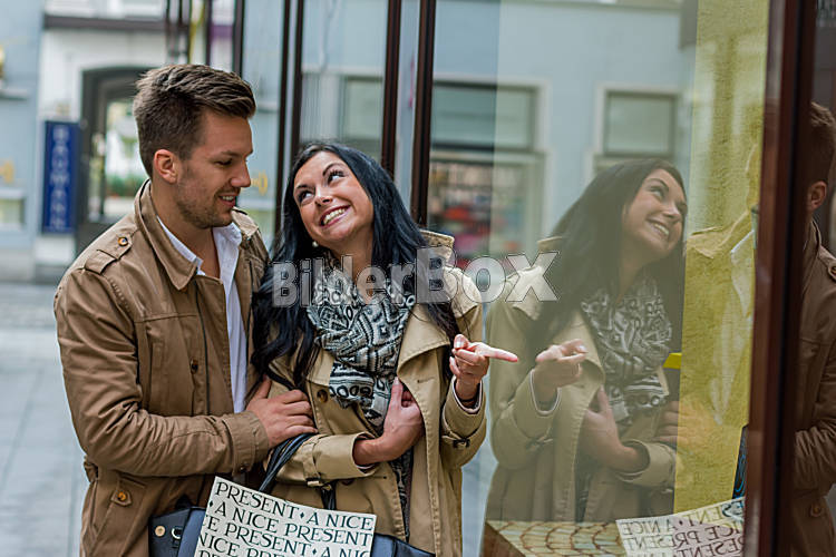 Beschreibung Junges Paar beim Einkausbummel. Shoppen in der Stadt macht Freude